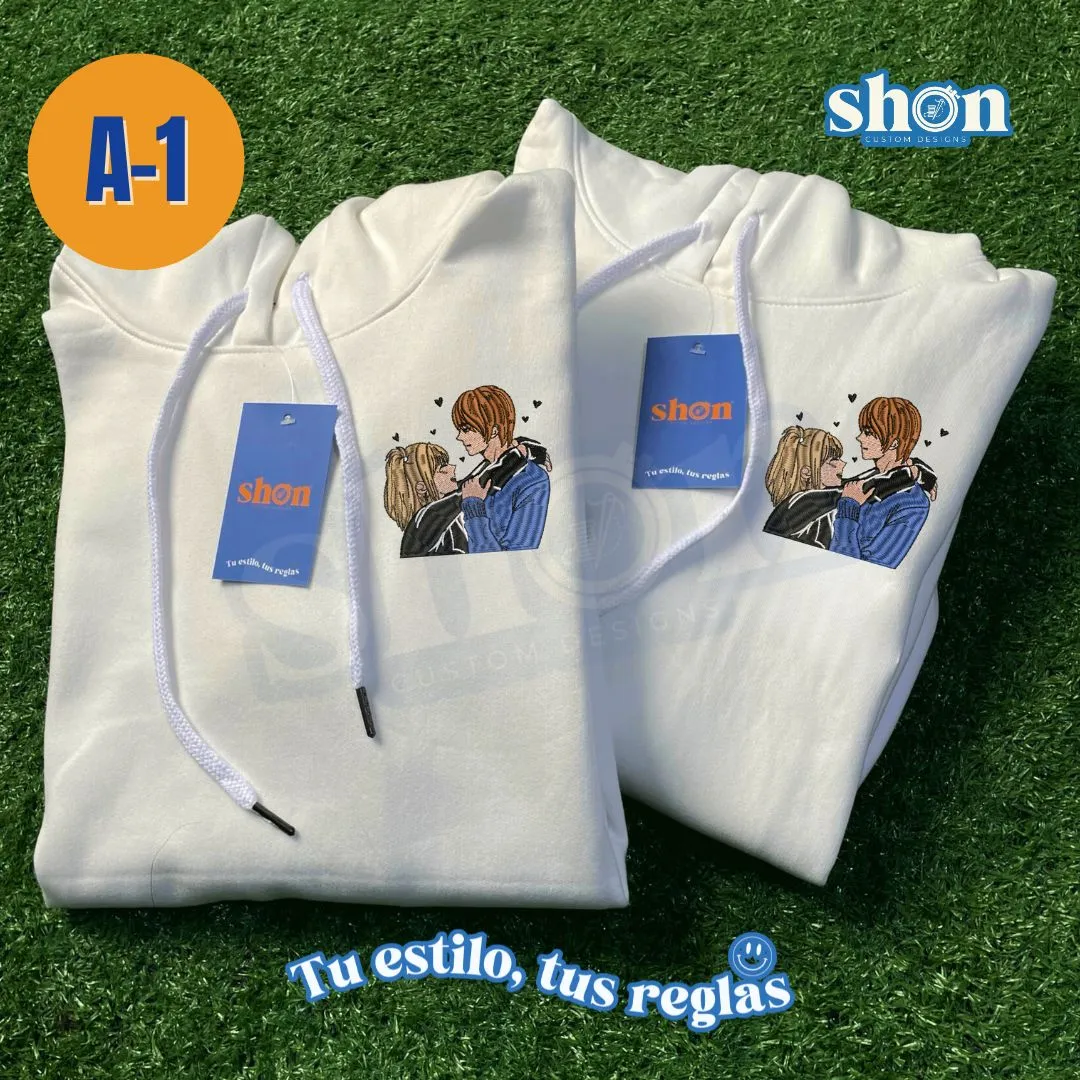 Set de poleras con capucha confeccionadas en algodón suave y abrigador, ideales para compartir momentos especiales en pareja. Cada polera